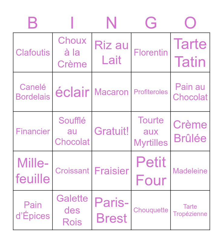 This bingo card has a free space and 24 words: Croissant, Galette des Rois, Macaron, Pain d’Épices, Tarte Tatin, Clafoutis, Canelé Bordelais, Choux à la Crème, Tourte aux Myrtilles, Fraisier, Profiteroles, Financier, Petit Four, Madeleine, éclair, Chouquette, Crème Brûlée, Riz au Lait, Pain au Chocolat, Soufflé au Chocolat, Tarte Tropézienne, Mille-feuille, Florentin and Paris-Brest.