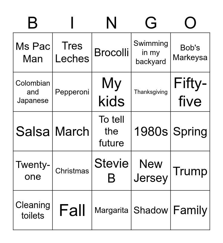 This bingo card has 60 words: Patricia, Fall, Sweet Tea, Twenty-one, Shadow, Mint chocolate chip / Peanut butter, Pepperoni, Pumpkin, Thanksgiving, Dunkin' Donuts, Swimming in my backyard, Purple and green, Colombian and Japanese, Chicago PD, Flan, Ms Pac Man, To tell the future, Bob's Markeysa, Stay at home mom, cop, wrestler, My kids, 1980s, Brocolli, Cleaning toilets, Trump, Spring love or party your body, North Carolina, Sushi, Lexus, Fifty-five, Oreo, Summer, Soda, Black, Law and Order, Tres Leches, Freestyle, Carpenter, March, Nights, Salsa, Relaxing, Christmas, Spring, Cooking, New Jersey, Florida, Salads, 1990s, three, Stevie B, Margarita, 1970s, Cookies, Fly, Mindreader, Chef, Mountains, Dancing with the stars, Family and Vacuuming.
