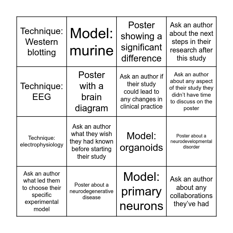This bingo card has 16 words: Poster about a neurodegenerative disease, Poster about a neurodevelopmental disorder, Poster showing a significant difference, Technique: Western blotting, Technique: electrophysiology, Model: murine, Model: organoids, Model: primary neurons, Technique: EEG, Poster with a brain diagram, Ask an author what led them to choose their specific experimental model, Ask an author about the next steps in their research after this study, Ask an author what they wish they had known before starting their study, Ask an author about any aspect of their study they didn’t have time to discuss on the poster, Ask an author if their study could lead to any changes in clinical practice and Ask an author about any collaborations they’ve had.