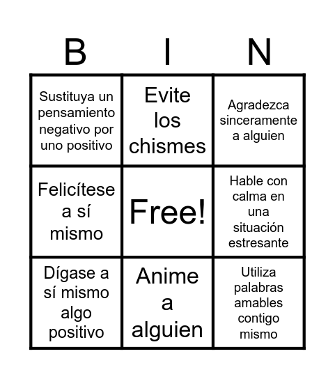 This bingo card has a free space and 25 words: Hacer un cumplido sincero a alguien, Evitar decir algo negativo sobre uno mismo, Anime a alguien, Escuche sin interrumpir, Utiliza palabras amables contigo mismo, Sustituya un pensamiento negativo por uno positivo, Hable con calma en una situación estresante, Evite los chismes, Exprese gratitud, Evite criticar a alguien, Utilice palabras para inspirar a alguien, Decida no extender la negatividad, Comparta una historia o un mensaje edificante, Discúlpese sinceramente, Dígase a sí mismo algo positivo, Evite quejarse durante una hora, Hable con amabilidad incluso cuando esté disgustado, Agradezca sinceramente a alguien, Olvida un comentario negativo del pasado, Recuerde a alguien sus fortalezas, Escriba algo positivo sobre sí mismo, Ofrezca palabras de ánimo a alguien con dificultades, Piense antes de hablar, Felicítese a sí mismo and Utiliza las palabras para traer paz en lugar de conflicto.