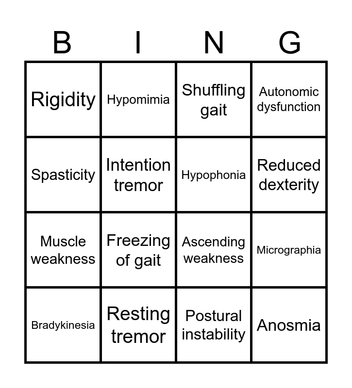 This bingo card has 16 words: Resting tremor, Micrographia, Shuffling gait, Rigidity, Muscle weakness, Hypomimia, Ascending weakness, Postural instability, Spasticity, Intention tremor, Bradykinesia, Autonomic dysfunction, Freezing of gait, Reduced dexterity, Hypophonia and Anosmia.