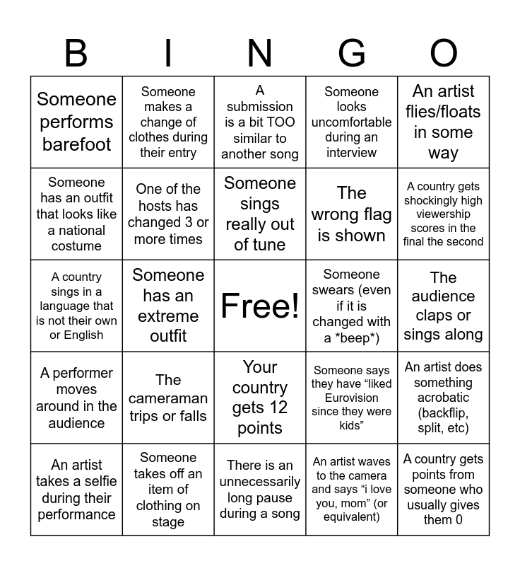 This bingo card has a free space and 24 words: The cameraman trips or falls, Someone takes off an item of clothing on stage, Someone sings really out of tune, An artist takes a selfie during their performance, An artist flies/floats in some way, Someone performs barefoot, Someone has an outfit that looks like a national costume, Someone makes a change of clothes during their entry, Someone swears (even if it is changed with a *beep*), Your country gets 12 points, The wrong flag is shown, A country sings in a language that is not their own or English, Someone says they have “liked Eurovision since they were kids”, An artist does something acrobatic (backflip, split, etc), One of the hosts has changed 3 or more times, An artist waves to the camera and says “i love you, mom” (or equivalent), The audience claps or sings along, A submission is a bit TOO similar to another song, A country gets shockingly high viewership scores in the final the second, Someone has an extreme outfit, A country gets points from someone who usually gives them 0, A performer moves around in the audience, Someone looks uncomfortable during an interview and There is an unnecessarily long pause during a song.