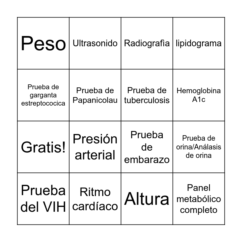This bingo card has 20 words: Prueba de orina/Análasis de orina, Electrocardiograma, Radiografìa, Tomografía computarizada, Prueba del VIH, Prueba de garganta estreptococica, Ritmo cardíaco, Peso, Gratis!, Ultrasonido, Presión arterial, Prueba de embarazo, Prueba de Papanicolau, Panel metabólico completo, Prueba de tuberculosis, Análisis de Sangre, Hemoglobina A1c, lipidograma, Altura and Prueba de la Gripe o COVID.