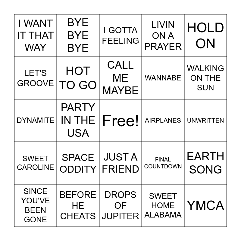 This bingo card has a free space and 38 words: ALL STAR, I WANNA DANCE WITH SOMEBODY, TALKING TO THE MOON, HOT TO GO, EARTH SONG, SPACE ODDITY, CALL ME MAYBE, UMBRELLA, HOLD ON, WANNABE, PARTY IN THE USA, LIVIN ON A PRAYER, YMCA, UNWRITTEN, LET'S GROOVE, SWEET CAROLINE, FLY ME TO THE MOON, I GOTTA FEELING, POUR SOME SUGAR ON ME, AIRPLANES, I WANT IT THAT WAY, BEFORE HE CHEATS, WALKING ON THE SUN, SINCE YOU'VE BEEN GONE, FRIENDS IN LOW PLACES, DROPS OF JUPITER, SPACE JAM, GOOD VIBRATIONS, DEFYING GRAVITY, ROCKET MAN, DON'T STOP BELIEVIN, JUST A FRIEND, SWEET HOME ALABAMA, BYE BYE BYE, SHAKE IT OFF, FINAL COUNTDOWN, DYNAMITE and HEY YA.