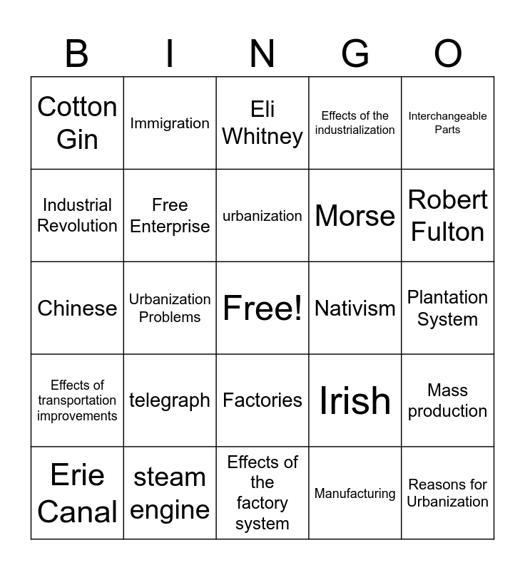 This bingo card has a free space and 24 words: telegraph, steam engine, urbanization, Erie Canal, Interchangeable Parts, Cotton Gin, Industrial Revolution, Immigration, Nativism, Factories, Morse, Chinese, Irish, Mass production, Free Enterprise, Manufacturing, Plantation System, Eli Whitney, Robert Fulton, Urbanization Problems, Reasons for Urbanization, Effects of transportation improvements, Effects of the industrialization and Effects of the factory system.
