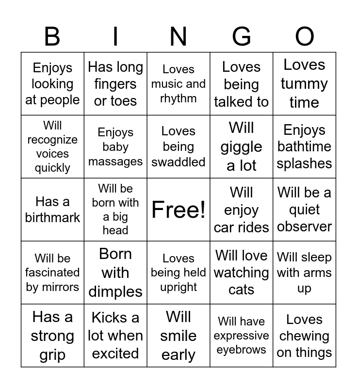 This bingo card has a free space and 25 words: Born with dimples, Will smile early, Loves being swaddled, Has a strong grip, Loves tummy time, Enjoys looking at people, Will recognize voices quickly, Has long fingers or toes, Will enjoy car rides, Loves being held upright, Will giggle a lot, Has a birthmark, Will love watching cats, Will sleep with arms up, Enjoys baby massages, Makes funny faces while sleeping, Will be a quiet observer, Loves music and rhythm, Enjoys bathtime splashes, Will be born with a big head, Loves chewing on things, Kicks a lot when excited, Will be fascinated by mirrors, Loves being talked to and Will have expressive eyebrows.