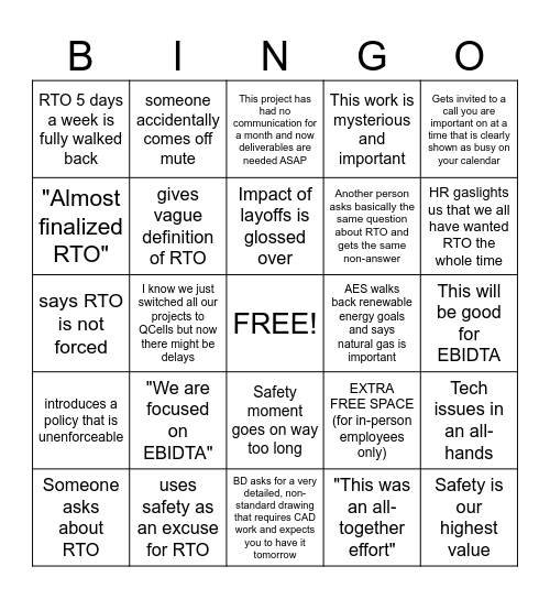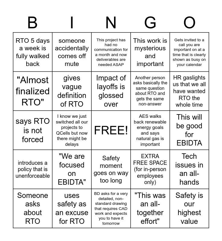 This bingo card has a free space and 24 words: "We are focused on EBIDTA", uses safety as an excuse for RTO, Impact of layoffs is glossed over, Someone asks about RTO, Gets invited to a call you are important on at a time that is clearly shown as busy on your calendar, RTO 5 days a week is fully walked back, "Almost finalized RTO", someone accidentally comes off mute, AES walks back renewable energy goals and says natural gas is important, Safety moment goes on way too long, Another person asks basically the same question about RTO and gets the same non-answer, says RTO is not forced, EXTRA FREE SPACE (for in-person employees only), Tech issues in an all-hands, gives vague definition of RTO, "This was an all-together effort", This will be good for EBIDTA, This project has had no communication for a month and now deliverables are needed ASAP, HR gaslights us that we all have wanted RTO the whole time, I know we just switched all our projects to QCells but now there might be delays, Safety is our highest value, introduces a policy that is unenforceable, This work is mysterious and important and BD asks for a very detailed, non-standard drawing that requires CAD work and expects you to have it tomorrow.