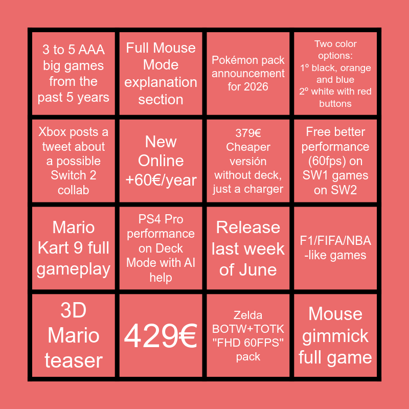 This bingo card has 16 words: 429€, F1/FIFA/NBA -like games, Pokémon pack announcement for 2026, 3 to 5 AAA big games from the past 5 years, Mario Kart 9 full gameplay, Full Mouse Mode explanation section, Release last week of June, Zelda BOTW+TOTK ''FHD 60FPS'' pack, Xbox posts a tweet about a possible Switch 2 collab, New Online +60€/year, 3D Mario teaser, Two color options: 1º black, orange and blue 2º white with red buttons, PS4 Pro performance on Deck Mode with AI help, Free better performance (60fps) on SW1 games on SW2, 379€ Cheaper versión without deck, just a charger and Mouse gimmick full game.