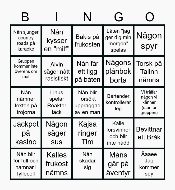 This bingo card has a free space and 24 words: Någon säger sus, Kalles frukost nämns, Nån får ett ligg på båten, Nån blir för full och hamnar i fyllecell, Någon spyr, Nån sjunger country roads på karaoke, Gruppen kommer inte överens om mat, Nån kysser en "milf", Bartender kontrollerar leg, Kajsa ringer Tim, Någons plånbok borta, Nån nämner texten på tröjorna, Kalle försvinner och blir inte nådd, Bevittnar ett Bråk, Alvin säger nått rasistiskt, Måns går på äventyr, Vi träffar någon vi känner (utanför gruppen), Bakis på frukosten, Torsk på Talinn nämns, Linus spelar Reaktor läck, Äaaee Jag kommer spy, Jackpot på kasino, Låten "jag ger dig min morgon" spelas and Nån skadar sig.