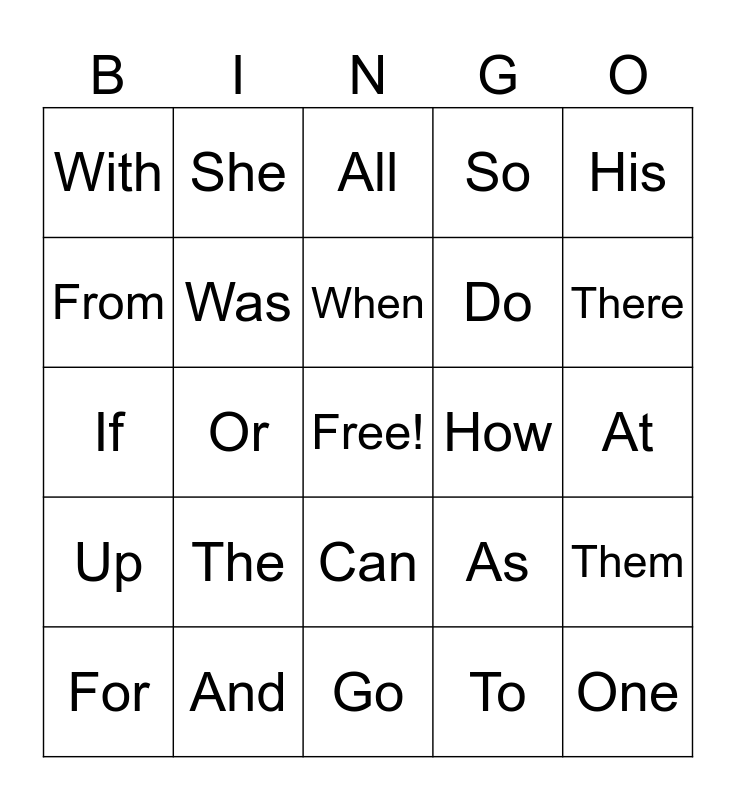 This bingo card has a free space and 24 words: The, And, When, For, His, With, From, She, How, Can, Do, If, As, Them, Was, To, At, All, There, Or, One, Up, So and Go.
