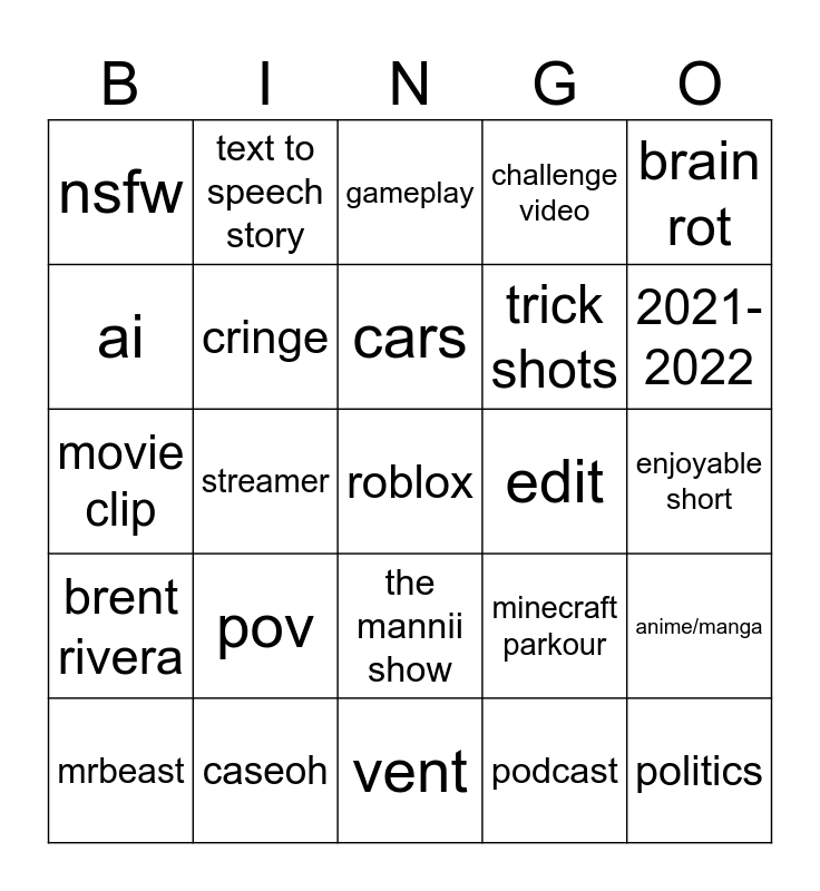 This bingo card has a free space and 24 words: pov, caseoh, cars, mrbeast, brain rot, nsfw, ai, text to speech story, edit, the mannii show, trick shots, movie clip, minecraft parkour, anime/manga, cringe, podcast, enjoyable short, gameplay, 2021-2022, streamer, politics, brent rivera, challenge video and vent.