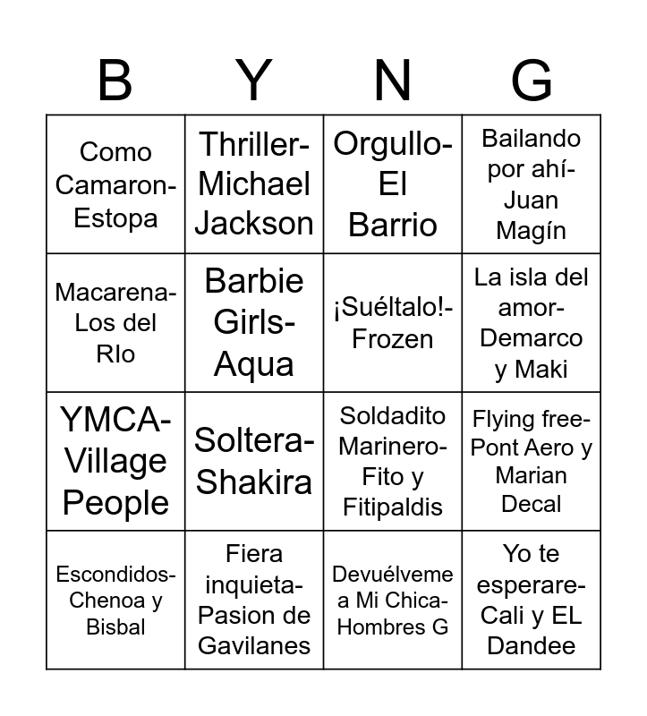 This bingo card has 195 words: Mamma Mia, Yo Quiero Bailar- Sonia Y Selena, Asereje- Las Ketchup, Waka Waka- Shakira, Sabor de Amor- Danza Invisible, A Quien Le Importa- Alaska, Girls Just Want To Have Fun- Cyndi Lauper, Bohemian Rhapsody- Queen, You're The One That I Want- Grease, YMCA- Village People, Por La Boca Vive El Pez- Fito y Fitipaldis, Tanto la queria- Andy&Lucas, Son de Amores- Andy&Lucas, Tanto la Queria- Nena Daconte, Amiga Mia- Alejandro Sanz, Corazon Partió- Alejandro Sanz, Y, ¿Si Fuera ella?- Alejandro Sanz, La tortura- Shakira y Alejandro Sanz, Ave Maria- David Bisbal, Bulería- David Bisbal, Como una Ola- Rocio Jurado, La gata bajo la lluvia- Rocio Durcal, Sin Miedo a Nada- Alex Ubago, Morena Mia- Miguel Bose, Colgando en tus manos- Carlos Baute y Marta Sanchez, 1+1 Son 7- Fran Perea, La mujer de Verde- Ízalos, 100 gaviotas- Duncan Dhu, Antes Muerta Que Sencilla- Maria Isabel, Nada fue un Error- Coti, Maria- Ricky Martin, Baby Shark (canción infantil), Todos los dias sale el Sol- Bongo Botrako, Killing me Softly With his song- Pitingo, Pa'Madrid- El Barrio, Mientes- Camila, Suavemente- Elvis Crespo, Cuando tu Vas- Chenoa, A tu vera- Lola Flores, Marta, Sebas, Guille y los demás- Amaral, Fisica Y Quimica- Despistaos, Papi Chulo- Lorna, Gasolina- Daddy Yankee, Cuando Zarpa el amor- Camela y Juan Magín, Don Diablo- Miguel Bose, No me doy por vencido- Luis Fonsi, Como Camaron- Estopa, Princesas- Pereza, Escuela de Calor- Radio Futura, Macarena- Los del RIo, Bailando por ahí-Juan Magín, Soldadito Marinero- Fito y Fitipaldis, Caminando por la vida- Melendi, Bailando- Alaska, Aqui no hay Playa- Los Refrescos, Como yo te amo- Rocio Jurado, 20 de abril- Celtas Cortos, Escondidos- Chenoa y Bisbal, Europe's Living a Celebration- Rosa Lopez (Eurovision), Mi musica es tu voz- Operacion Triunfo, Por la raja de tu Falda- Estopa, I will always love you- Whitney Houston, Paraiso- Dvicio, Aprendiz- Malu, Sobrevivire- Monica Naranjo, Desesperada- Marta Sanchez, Every time we touch-Cascada, Flying free- Pont Aero y Marian Decal, Despacio- Luis Fonsi y Daddy Yankee, La Flaca- Jarabe de Palo, La vida es un Carnaval- Celia Cruz, Mediterraneo- Los Rebeldes, Thriller- Michael Jackson, Everybody- Backstreet Boys, Te quiero mas- Formula Abierta, Dramas y Comedias- Alaska, Yo te esperare- Cali y EL Dandee, Hakuna Matata- Rey Leon, Malamente- Rosalia, Azul- Cristian Castro, 2 hombres y 1 destino- Alex y Bustamante, Este amor no se toca- Yuri, Torero- Chayanne, Color Esperanza- Diego Torres, La isla del amor- Demarco y Maki, Sirenas- Taburete, Mi Heroe- Antonio Orozco, Que bonito es Querrer- Manuel Carrasco, Te he echado de menos- Pablo Alboran, Solamente tu- Pablo Alboran, Soltera- Shakira, Besos- El canto del Loco, Zapatillas- El canto del Loco, La camisa Negra- Juanes, Pobre Diabla- Don Omar, Noche de Travesuras- Hector, Perdóname- David Civera, Abre tu Mente- Merche, Como Ronea- Las Chuches, Obsesion- Aventura, Dragostea Din Tei- Ozone, Buscante un hombre que te quiera- El Arrebato, MariaCaipirinha- Carlinhos Brown, Mami- David Bisbal, El Burrito Sabanero- David Bisbal, 90 Minutos- India Martinez, El baile de la Botella, Que nadie Brinque(Verbena), Zorra- Nebulossa, Potra Salvaje- Isabel Aun, El Anillo- Jenifer Lopez, La Mordida- Ricky Martin, La Mujer del Pelotero (Verbena), Mari Carmen- La Pegatina, Kitt y los coches del pasado- Ladilla Rusa, Alcohol, Alcohol, Alcohol- Los inhumanos, Fiesta Pagana- Mago de Oz, Cannabis- Ska-P, No Rompas mi Corazon- Coyote Dax, Que la Detengan- David Civera, Mayonesa- Chocolate(Verbena), Que Genotípico que estoy- Mójinos Escozios, Limbo- Daddy Yankee, La gozadera- Gente de zona y Marc Anthony, Madre Tierra- Chayanne, Me llamo María- María Figueroa, El Run Run- Estopa y Rosario Flores, Valio la pena- Marc Anthony, Wannabe- Spice Girls, La Madre de Jose- El Canto del Loco, Sarandonga- Lolita, La Bomba- King Africa, El baile del Gorila- Melody, Devuélveme a Mi Chica- Hombres G, Purpurina- Alberto Gambino, Mi gran Noche- Raphael, La Amapola- Charanga, Amigos para Siempre- Los Manolos, Solo se Vive una Vez- Azucar Moreno, Ven Devorame otra vez- Azucar Moreno, Hay que Venir al sur- Raffaella Carra, Tractor Amarillo- Zapato Veloz, La Chica Ye ye- Concha Velazco, Vivir Asi es Morir de Amor- Camilo sesto, Barbie Girls- Aqua, Dame Veneno- Los Chunguitos, Tombola- Marisol, ¡Chas! Y aparezco a tu lado- Alex y Cristina, Mandanga Style- Amador Rivas, Levantando las Manos- El simbolo, Salta!!- Tequila, El Taxi- Pitbull, Gangnam Style- Psy (la cancion del chino), Sin Pijama- Becky G y Natti Natasha, Saturday Night- Whigfield (las babys Antigua), Quitate el Top- Kiko Rivera, El flow de la cucaracha, La canción del Velero- La fiesta, Te Pintaron Pajaritos en el Aire- Yandar & Postín, Campeones- Oliver y Beji, La Luna y El Toro- El Matador, El Tiburon- Henry Mendez, El Serrucho-Verbena, Orgullo- El Barrio, Que viva España- Manolo Escobar, Nada que perder- Pignoise (los Hombres de Paco), Noches de Bohemia- Navajita Platea, Cai- Niña Pastori, Válgame Dios- Niña Pastori, Amor de San Juan- Niña Pastori, El Vaquilla- Los Chichos, Bandido- Azucar Moreno, La Zarzamora- Lola Flores, Cartita de Amor- Niña Pastori, El toro Guapo- El fary, ¡Hola, Mi amor!- Junco, Ni mas Ni menos- Los Chichos, Alba- Antonio Flores, Tu me dejaste de Querer- Ctangana y La húngara (tiritititi tiritititi), Hijo de la Luna- Mecanografiadme, No me Acuerdo-Thalia y Natti Natasha, Un mundo ideal- Aladdin, Bajo del Mar- La sirenita, De Cero a Heroe- Hercules, Los pequeños sastres- Cenicienta, Hijo de Hombre- Tarzan, ¡Suéltalo!- Frozen, Hay un amigo en mi- Toy Story, Livin'la Vida Loca- Ricky Martin, Marta Tiene un marcapasos- Hombres G, Hablando en plata- Melendi, Dime- Beth (Eurovision), Me Pongo colorada- Papa Levante, Fiera inquieta- Pasion de Gavilanes and Tequila- Azucar Morena.
