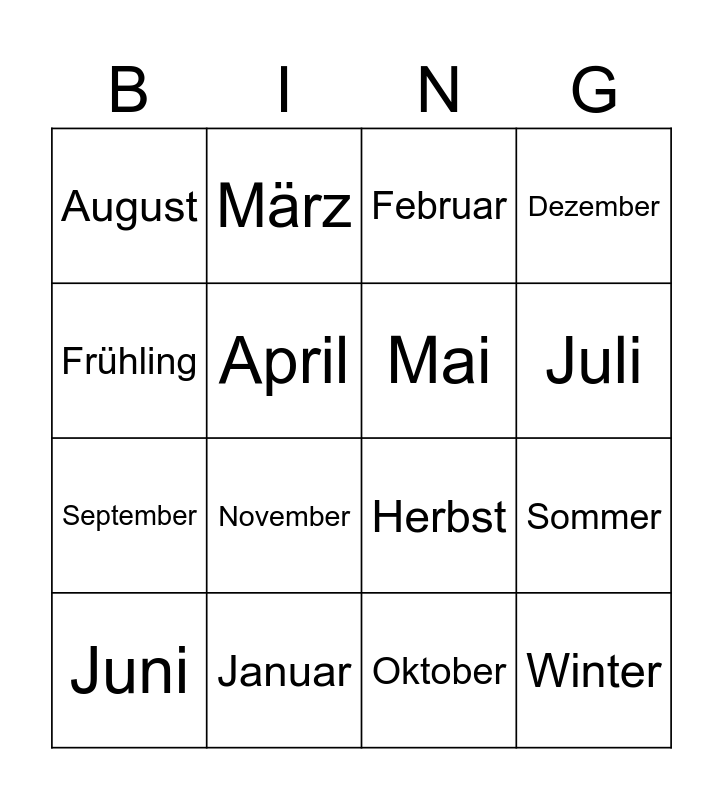 This bingo card has 16 words: Januar, Sommer, Februar, August, September, März, Herbst, Oktober, Frühling, April, Juni, Dezember, November, Juli, Mai and Winter.