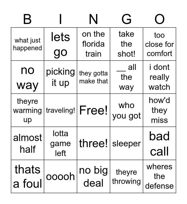 This bingo card has a free space and 24 words: lotta game left, ooooh, they gotta make that, thats a foul, too close for comfort, what just happened, no way, lets go, who you got, three!, __ all the way, theyre warming up, sleeper, bad call, picking it up, theyre throwing, how'd they miss, on the florida train, i dont really watch, traveling!, wheres the defense, almost half, take the shot! and no big deal.