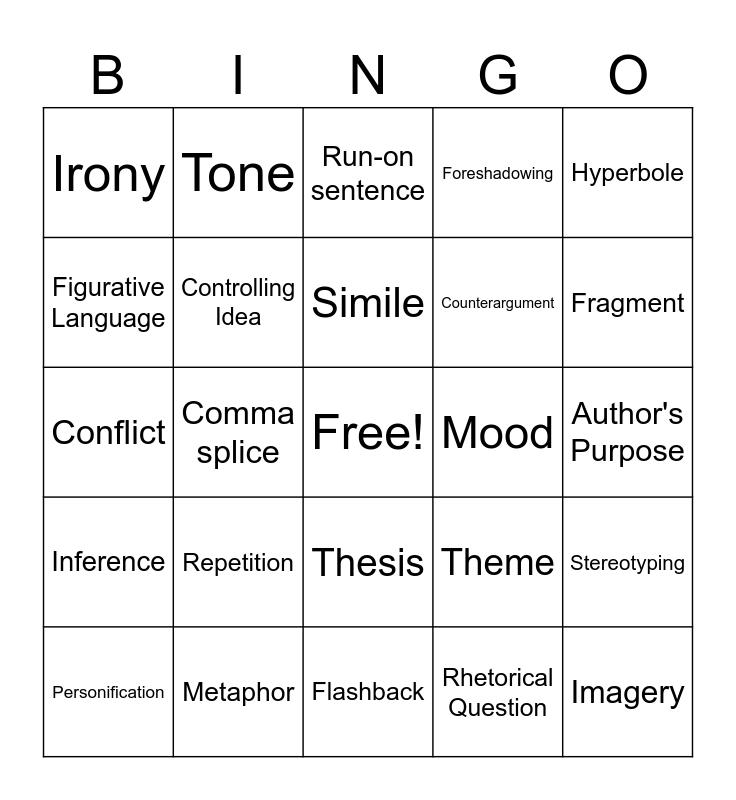 This bingo card has a free space and 24 words: Repetition, Metaphor, Simile, Personification, Hyperbole, Irony, Figurative Language, Tone, Mood, Thesis, Counterargument, Conflict, Theme, Stereotyping, Controlling Idea, Rhetorical Question, Author's Purpose, Run-on sentence, Fragment, Comma splice, Imagery, Inference, Foreshadowing and Flashback.