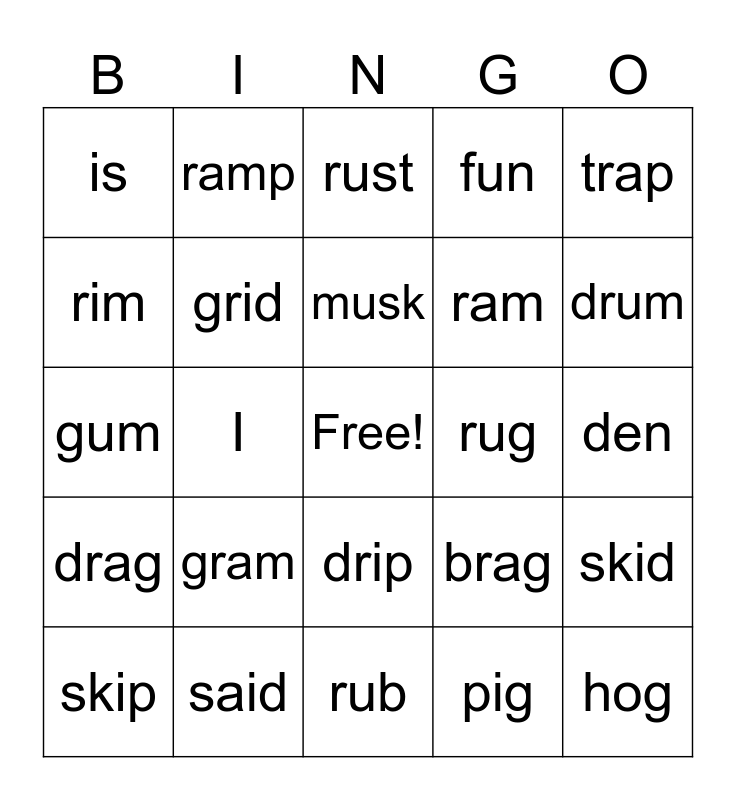 This bingo card has a free space and 30 words: said, see, I, of, is, rust, grid, drip, rug, rub, den, hog, pig, run, drum, frog, brag, drag, gram, trap, gum, gap, ramp, ram, rim, fun, skid, skip, musk and kids.