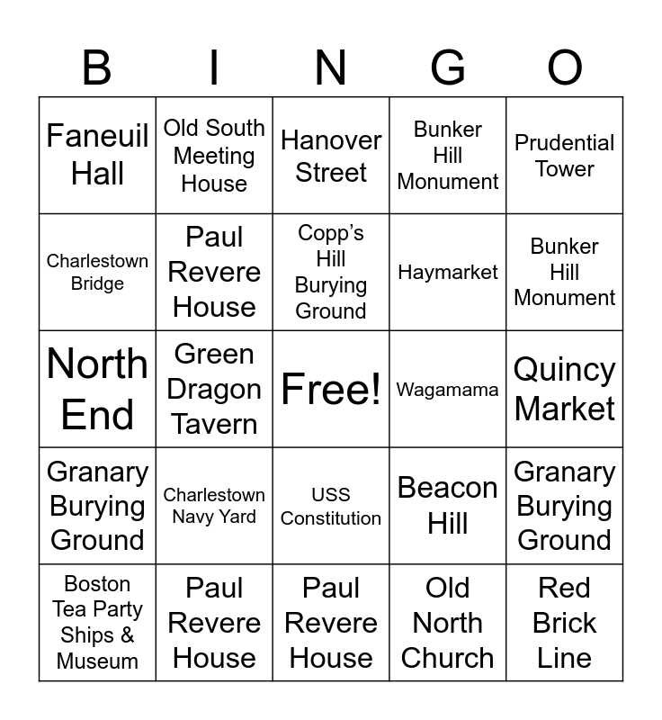 This bingo card has a free space and 35 words: Paul Revere, Freedom Trail, Old North Church, Paul Revere House, USS Constitution, Bunker Hill Monument, Charlestown Bridge, Faneuil Hall, Copp’s Hill Burying Ground, Ned Devine’s, North End, Prudential Tower, Fenway Park, Bunker Hill Monument, Faneuil Hall, Wagamama, Old North Church, Green Dragon Tavern, Granary Burying Ground, Red Brick Line, Beacon Hill, Boston Tea Party Ships & Museum, Granary Burying Ground, Paul Revere House, Hanover Street, Bunker Hill Monument, The T, The Bostonian, Haymarket, Quincy Market, Boston Common, Paul Revere House, Charlestown Navy Yard, Old South Meeting House and Antico Forno.
