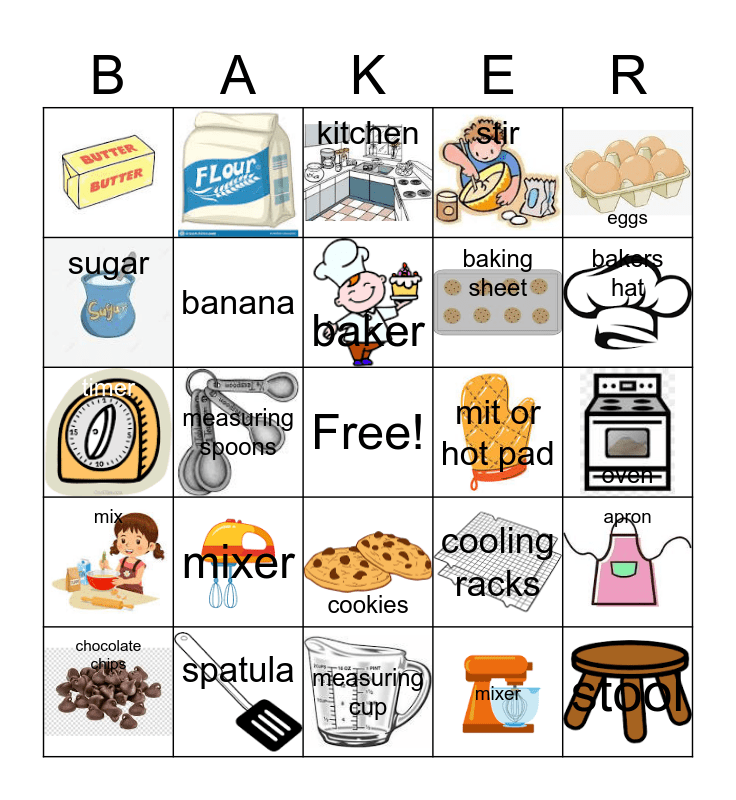 This bingo card has 24 images, a free space and 24 words: cookies, mixer, baker, spatula, eggs, sugar, oven, cooling racks, baking sheet, timer, apron, chocolate chips, measuring spoons, whisk, stir, mix, kitchen, stool, bakers hat, measuring cup, mit or hot pad, mixer, banana and cupcake liners.