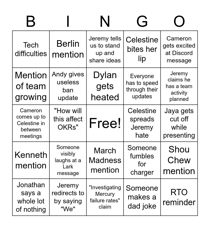 This bingo card has a free space and 24 words: Someone visibly laughs at a Lark message, Jeremy redirects to by saying "We", Dylan gets heated, Jonathan says a whole lot of nothing, Cameron gets excited at Discord message, Tech difficulties, Mention of team growing, Berlin mention, Celestine spreads Jeremy hate, March Madness mention, Everyone has to speed through their updates, Cameron comes up to Celestine in between meetings, Someone fumbles for charger, Shou Chew mention, Andy gives useless ban update, Someone makes a dad joke, Jaya gets cut off while presenting, Jeremy tells us to stand up and share ideas, Jeremy claims he has a team activity planned, "How will this affect OKRs", RTO reminder, Kenneth mention, Celestine bites her lip and "Investigating Mercury failure rates" claim.
