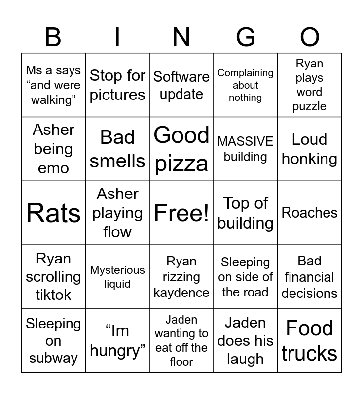 This bingo card has a free space and 24 words: Sleeping on subway, Mysterious liquid, Good pizza, Jaden does his laugh, Ryan plays word puzzle, Ms a says “and were walking”, Stop for pictures, Software update, Top of building, Roaches, Rats, Bad smells, Sleeping on side of the road, Bad financial decisions, Asher being emo, “Im hungry”, Jaden wanting to eat off the floor, Complaining about nothing, Loud honking, Ryan scrolling tiktok, Asher playing flow, Ryan rizzing kaydence, MASSIVE building and Food trucks.