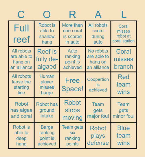 This bingo card has a free space and 31 words: Team gets six ranking points, Close scores (within 5 points), Human player misses barge, R2JESU wins!!!, Full reef, More than one coral is scored in auto, Reef is fully de-algaed, Team gets major foul, Coopertion is achieved, Robot plays defense, Red team wins, Blue team wins, Robot scores algae into barge, Coral gets stuck in robot, Coral misses branch, Coral scored on all 4 levels, Team gets minor foul, Robot has ground intake, Robot has algae and coral, Robot stops moving, Coral misses robot at coral station, Team name is mispronounced, Robot is able to deep hang, Robot is able to shallow hang, No robots are able to hang on an alliance, All robots are able to hang on an alliance, All robots score during auto, All robots leave the starting line, Barge ranking point is achieved, Auto ranking point is achieved and Robot hangs before endgame.