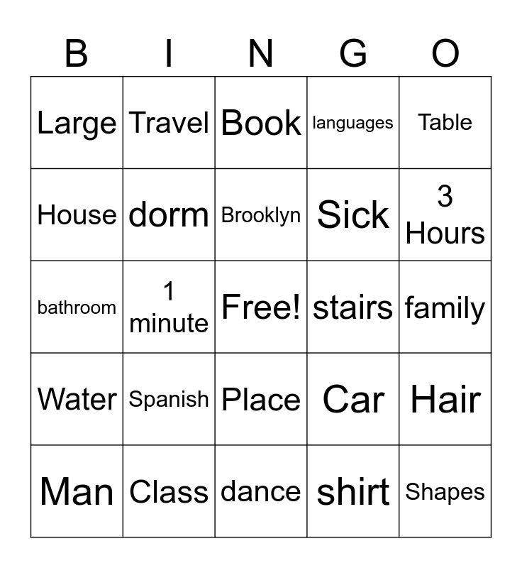 This bingo card has a free space and 24 words: Spanish, Class, Brooklyn, Man, Table, Large, House, Travel, stairs, Place, Sick, bathroom, Car, Hair, dorm, shirt, family, Book, 3 Hours, 1 minute, Shapes, Water, languages and dance.