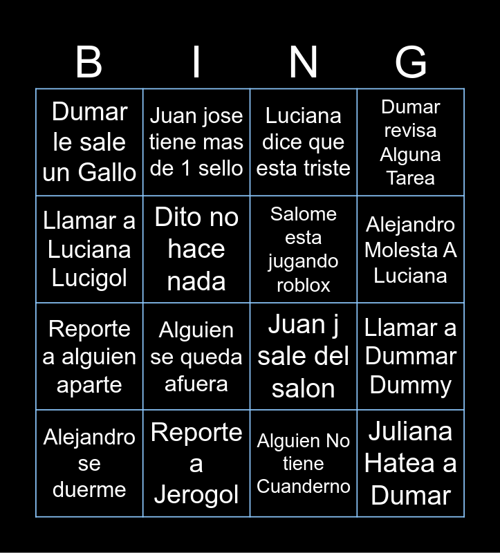 This bingo card has 20 words: Llamar a Dummar Dummy, Reporte a Felipe, Luciana dice que esta triste, Salma dice que esta triste, Alejandro se duerme, Llamar a Luciana Lucigol, Reporte a Jerogol, Dumar le sale un Gallo, Reporte a alguien aparte, Juan jose tiene mas de 1 sello, Alguien se queda afuera, Juan j sale del salon, Dito no hace nada, Juliana Hatea a Dumar, Salome esta jugando roblox, Dario molesta a salma, Alejandro Molesta A Luciana, Dumar revisa Alguna Tarea, Alguien No tiene Cuanderno and Nachin le hace una llave a alguin.