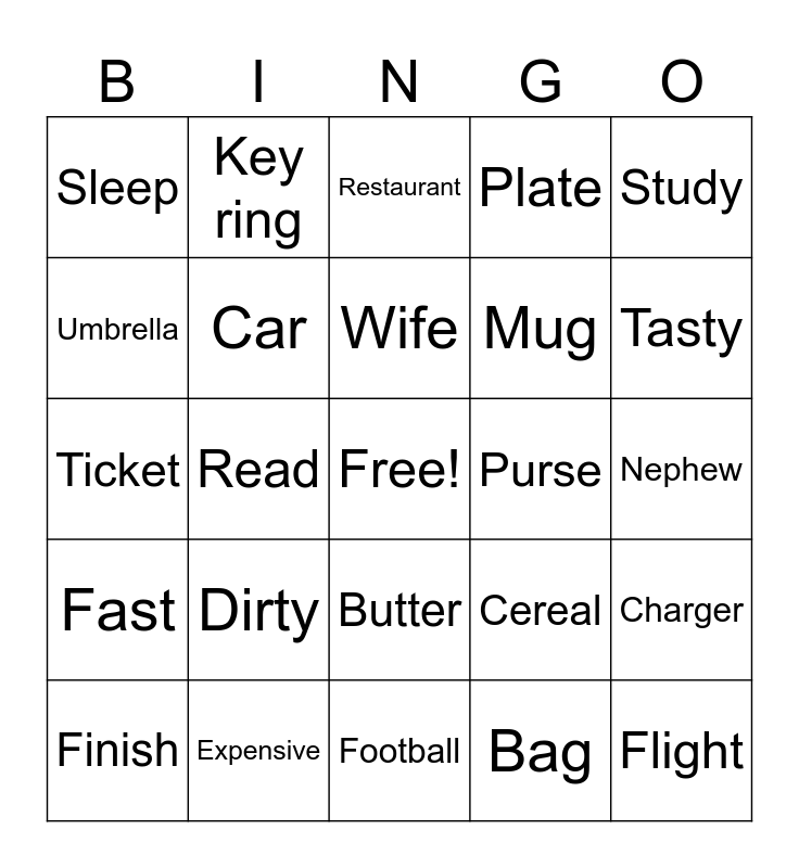 This bingo card has a free space and 31 words: Football, Music, Read, Play, Sleep, Restaurant, Car, Cereal, Purse, Bag, Nephew, Flight, Meal, Cook, Tasty, Newspaper, Charger, Dirty, Fast, Butter, Study, Flat, Finish, Key ring, Mug, Umbrella, Plate, Ticket, Expensive, Wife and Meat.