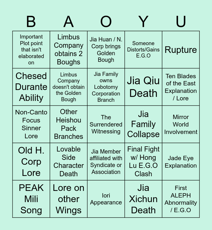 This bingo card has a free space and 28 words: Jade Eye Explanation, New Association Branch Intro, Jia Qiu Death, Jia Xichun Death, Chesed Durante Ability, Jia Huan / N. Corp brings Golden Bough, Limbus Company obtains 2 Boughs, Old H. Corp Lore, Jia Family Collapse, PEAK Mili Song, Non-Canto Focus Sinner Lore, Someone Distorts/Gains E.G.O, Lore on other Wings, Iori Appearance, Ten Blades of the East Explanation / Lore, Shi Family Lore, Lovable Side Character Death, Limbus Company doesn't obtain the Golden Bough, Jia Family owns Lobotomy Corporation Branch, Jia Member affiliated with Syndicate or Association, Important Plot point that isn't elaborated on, Carmen/Ayin namedrop, First ALEPH Abnormality / E.G.O, Other Heishou Pack Branches, Mirror World Involvement, Final Fight w/ Hong Lu E.G.O Clash, Rupture and The Middle Remembers. (Free).