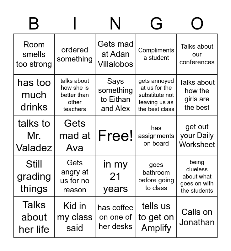 This bingo card has a free space and 24 words: Gets angry at us for no reason, Kid in my class said, Says something to Eithan and Alex, Talks about her life, Talks about our conferences, Room smells too strong, has too much drinks, ordered something, has assignments on board, in my 21 years, gets annoyed at us for the substitute not leaving us as the best class, talks to Mr. Valadez, goes bathroom before going to class, being clueless about what goes on with the students, talks about how she is better than other teachers, tells us to get on Amplify, get out your Daily Worksheet, Gets mad at Adan Villalobos, Talks about how the girls are the best, Gets mad at Ava, Calls on Jonathan, Still grading things, Compliments a student and has coffee on one of her desks.