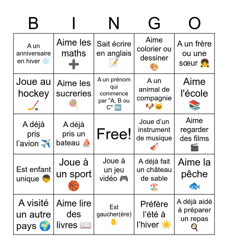 This bingo card has a free space and 24 words: Joue à un sport 🏀, Aime lire des livres 📖, A un prénom qui commence par "A, B ou C" 🔤, A visité un autre pays 🌍, A un frère ou une sœur 👧, A un anniversaire en hiver ❄️, Joue au hockey🏒, Aime les maths ➕, Joue d’un instrument de musique 🎻, Joue à un jeu vidéo 🎮, A un animal de compagnie 🐶🐱, A déjà pris l’avion ✈️, A déjà fait un château de sable 🏖️, Aime la pêche🐟, Aime les sucreries 🍭, Préfère l’été à l’hiver ☀️, Aime regarder des films 🎬, Sait écrire en anglais 📝, Aime l'école📚, A déjà pris un bateau ⛵, A déjà aidé à préparer un repas 🍳, Est enfant unique 👦, Aime colorier ou dessiner 🎨 and Est gaucher(ère) ✋.