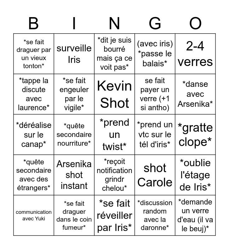 This bingo card has a free space and 24 words: Arsenika shot instant, *se fait draguer dans le coin fumeur*, Kevin Shot, communication avec Yuki, 2-4 verres, *se fait draguer par un vieux tonton*, *tappe la discute avec laurence*, surveille Iris, *prend un vtc sur le tél d'iris*, *reçoit notification grindr chelou*, se fait payer un verre (+1 si antho), *déréalise sur le canap*, shot Carole, *oublie l'étage de Iris*, *se fait engeuler par le vigile*, *discussion random avec la daronne*, *gratte clope*, *dit je suis bourré mais ça ce voit pas*, *danse avec Arsenika*, *quête secondaire nourriture*, *demande un verre d'eau (il va le beuj)*, *quête secondaire avec des étrangers*, (avec iris) *passe le balais* and *se fait réveiller par Iris*.
