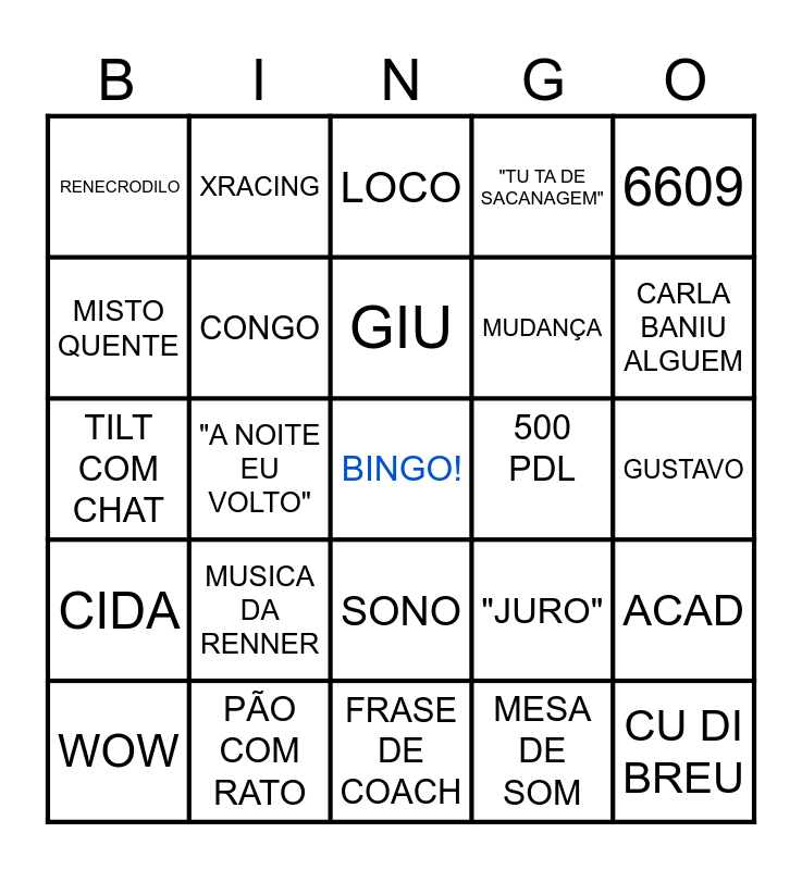 This bingo card has a free space and 24 words: WOW, MUSICA DA RENNER, GIU, MESA DE SOM, 6609, RENECRODILO, XRACING, LOCO, 500 PDL, GUSTAVO, TILT COM CHAT, CONGO, "JURO", ACAD, MISTO QUENTE, PÃO COM RATO, FRASE DE COACH, "TU TA DE SACANAGEM", CARLA BANIU ALGUEM, CIDA, "A NOITE EU VOLTO", SONO, MUDANÇA and CU DI BREU.