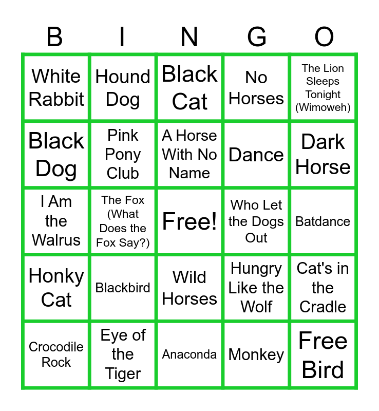 This bingo card has a free space and 24 words: Blackbird, Eye of the Tiger, A Horse With No Name, Crocodile Rock, The Lion Sleeps Tonight (Wimoweh), White Rabbit, Black Dog, Hound Dog, Who Let the Dogs Out, Wild Horses, Dance, I Am the Walrus, Hungry Like the Wolf, Cat's in the Cradle, Pink Pony Club, Monkey, Batdance, Black Cat, Dark Horse, The Fox (What Does the Fox Say?), Free Bird, Honky Cat, No Horses and Anaconda.