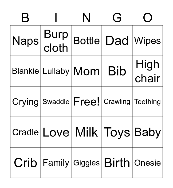 This bingo card has a free space and 28 words: Baby, Bassinet, Bib, Birth, Blankie, Bottle, Burp cloth, Cradle, Crawling, Crib, Crying, Dad, Family, Giggles, High chair, Labor, Love, Lullaby, Mom, Milk, Naps, Nursing, Onesie, Swaddle, Teething, Toys, Wipes and Pajamas.