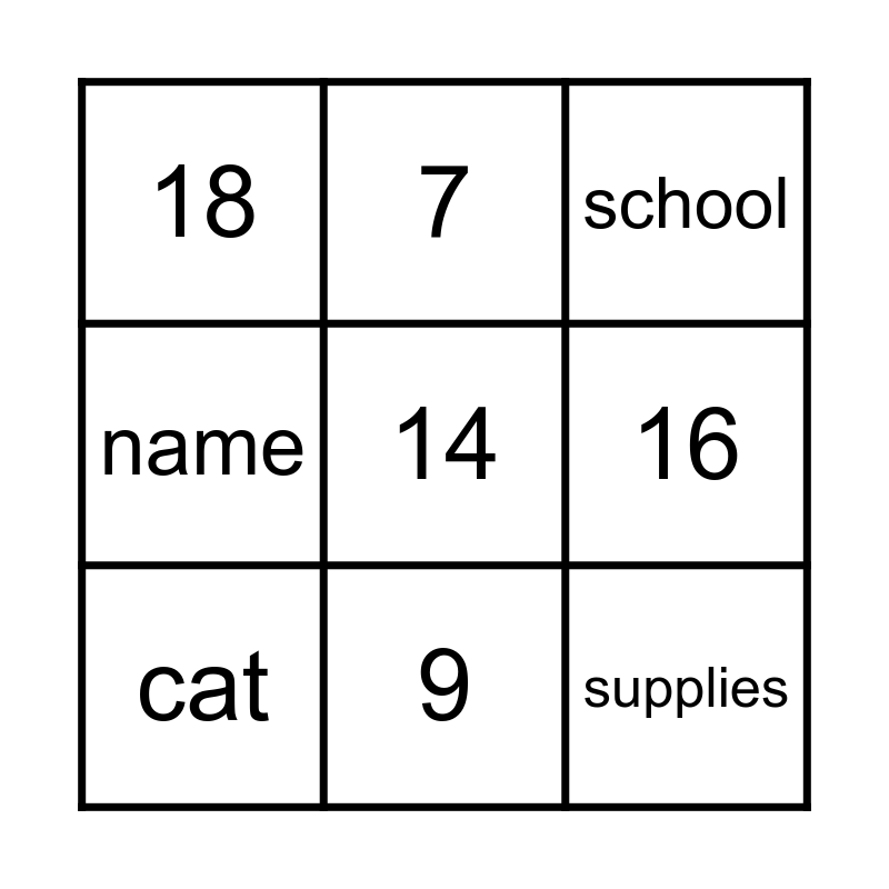 This bingo card has 68 words: 1, 2, 3, 4, 5, 6, 7, 8, 9, 10, 11, 12, 13, 14, 15, 16, 17, 18, 19, 20, supplies, sharpener, pencil, colors, rules, classroom, jacket, jeans, dog, chicken, school, caminito, english, is, name, animals, ruler, mouth, senses, present, happy, sad, cat, snake, mouse, bear, laptop, chair, desk, chicken, teacher, marker, green, blue, pink, yellow, first, second, third, fourth, fifth, sixth, seventh, date, house, breakfast, dinner and shower.