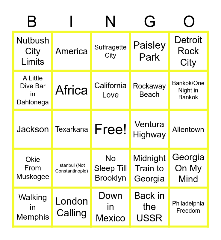 This bingo card has a free space and 24 words: Istanbul (Not Constantinople), London Calling, California Love, Walking in Memphis, Detroit Rock City, Nutbush City Limits, A Little Dive Bar in Dahlonega, America, Ventura Highway, No Sleep Till Brooklyn, Rockaway Beach, Jackson, Midnight Train to Georgia, Georgia On My Mind, Africa, Back in the USSR, Allentown, Suffragette City, Bankok/One Night in Bankok, Texarkana, Philadelphia Freedom, Okie From Muskogee, Paisley Park and Down in Mexico.