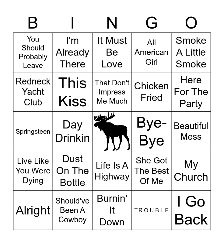 This bingo card has a free space and 81 words: Good Time, Remember When, It Must Be Love, Austin, Honey Bee, I'm Gonna Miss Her, She's Everything, Mud On The Tires, Red Dirt Road, Play Something Country, Neon Moon, Before He Cheats, All American Girl, You Should Probably Leave, Gettin' You Home, Redneck Yacht Club, Wagon Wheel, Dust On The Bottle, Meet In The Middle, Beautiful Mess, What Was I Thinking, Smoke A Little Smoke, Springsteen, That Don't Impress Me Much, This Kiss, This Is How We Roll, Friends In Low Places, Give It Away, Check Yes Or No, Redneck Woman, Here For The Party, Dirt Road Anthem, Burnin' It Down, I Am Not Okay, Alright, Bye-Bye, Seminole Wind, Sold, She Thinks My Tractor's Sexy, The Good Stuff, I Go Back, I Run To You, Bartender, Pontoon, Day Drinkin, Mr. Mom, I'm Already There, My Front Porch Lookin In, Country Girl, Rain Is A Good Thing, She Got The Best Of Me, My Church, This One's For The Girls, Drinkin' Problem, Kerosene, The House That Built Me, What Do You Think About That, Something To Be Proud Of, Maybe It Was Memphis, Just Another Day In Paradise, Life Is A Highway, Fancy, The Night The Light's Went Out In Georgia, Farmer's Daughter, Suds In The Bucket, Any Man Of Mine, Delta Dawn, Better Things To Do, Sin Wagon, Cowboy Take Me Away, Indian Outlaw, Live Like You Were Dying, Should've Been A Cowboy, Red Solo Cup, Watermelon Crawl, Ten Rounds With Jose Cuervo, It's A Great Day To Be Alive, T.R.O.U.B.L.E, Beer For My Horses, Chicken Fried and Toes In The Water.