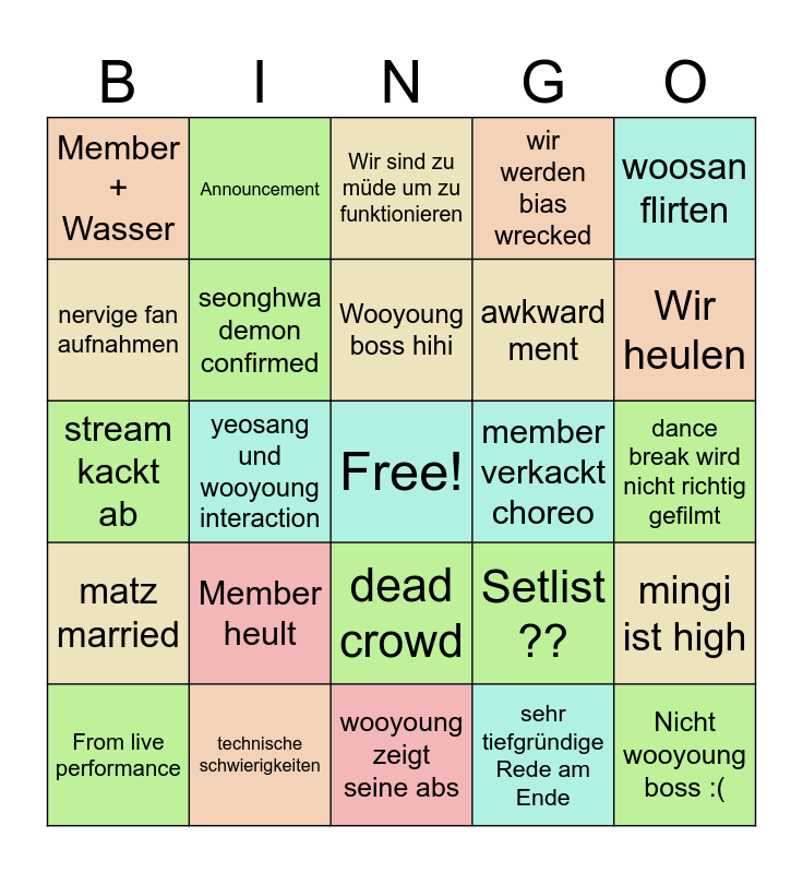 This bingo card has a free space and 24 words: Member heult, technische schwierigkeiten, Wooyoung boss hihi, From live performance, woosan flirten, Member + Wasser, nervige fan aufnahmen, Announcement, member verkackt choreo, dead crowd, awkward ment, stream kackt ab, Setlist ??, mingi ist high, seonghwa demon confirmed, sehr tiefgründige Rede am Ende, dance break wird nicht richtig gefilmt, Wir sind zu müde um zu funktionieren, Wir heulen, yeosang und wooyoung interaction, Nicht wooyoung boss :(, matz married, wir werden bias wrecked and wooyoung zeigt seine abs.