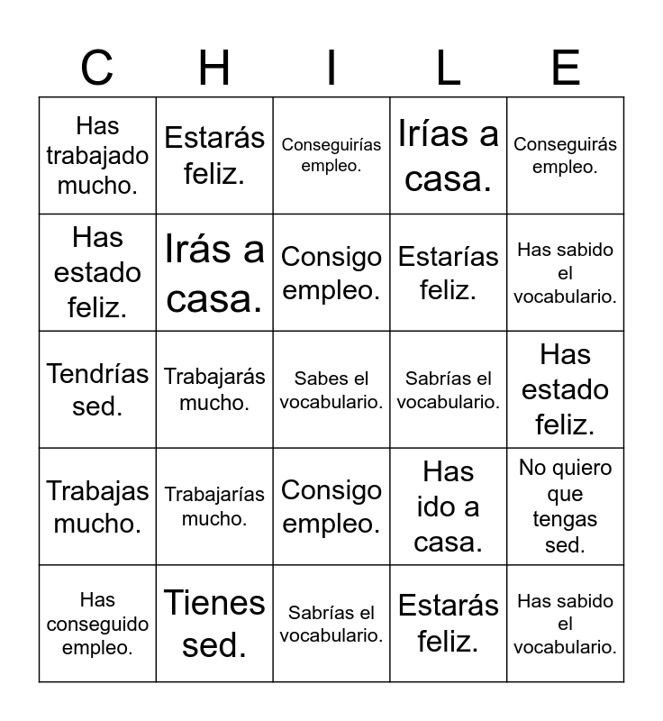 This bingo card has 60 words: Estás feliz., Tienes sed., Vas a casa., Trabajas mucho., Estarás feliz., Tendrás sed., Irás a casa., Trabajarás mucho., Estarías feliz., Tendrías sed., Irías a casa., Trabajarías mucho., Has estado feliz., Has tenido sed., Has ido a casa., Has trabajado mucho., Sabes el vocabulario., Conseguirás empleo., Sabrás el vocabulario., Consigo empleo., Sabrías el vocabulario., Conseguirías empleo., Has conseguido empleo., No quiero que tengas sed., Quiero que estés feliz., Quiero que vayas a casa., Quiero que trabajes mucho., Quiero que consigas empleo., Has sabido el vocabulario., Quiero que sepas el vocabulario., Estás feliz., Tienes sed., Vas a casa., Trabajas mucho., Estarás feliz., Tendrás sed., Irás a casa., Trabajarás mucho., Estarías feliz., Tendrías sed., Irías a casa., Trabajarías mucho., Has estado feliz., Has tenido sed., Has ido a casa., Has trabajado mucho., Sabes el vocabulario., Conseguirás empleo., Sabrás el vocabulario., Consigo empleo., Sabrías el vocabulario., Conseguirías empleo., Has conseguido empleo., No quiero que tengas sed., Quiero que estés feliz., Quiero que vayas a casa., Quiero que trabajes mucho., Quiero que consigas empleo., Has sabido el vocabulario. and Quiero que sepas el vocabulario..