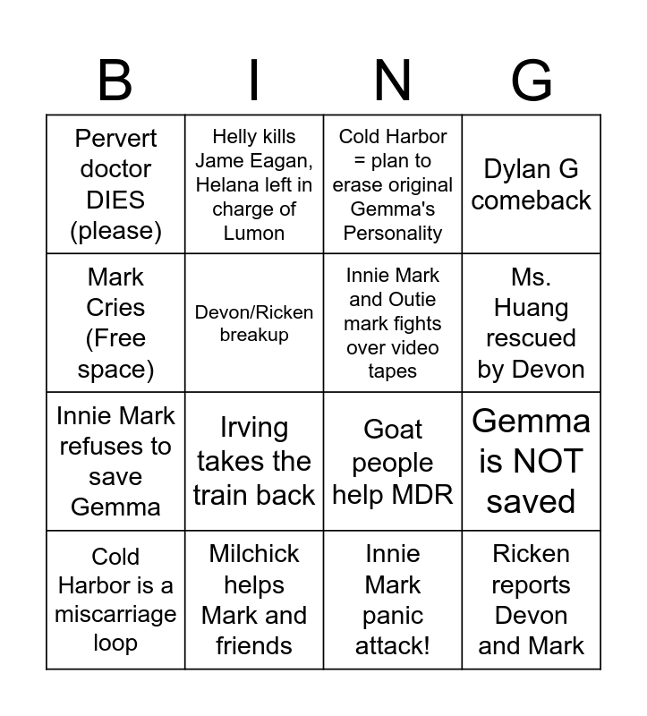 This bingo card has 16 words: Milchick helps Mark and friends, Gemma is NOT saved, Cold Harbor = plan to erase original Gemma's Personality, Pervert doctor DIES (please), Innie Mark refuses to save Gemma, Helly kills Jame Eagan, Helana left in charge of Lumon, Goat people help MDR, Innie Mark panic attack!, Mark Cries (Free space), Devon/Ricken breakup, Cold Harbor is a miscarriage loop, Dylan G comeback, Irving takes the train back, Ms. Huang rescued by Devon, Innie Mark and Outie mark fights over video tapes and Ricken reports Devon and Mark.