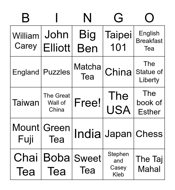 This bingo card has a free space and 24 words: Green Tea, Boba Tea, Matcha Tea, Chai Tea, English Breakfast Tea, William Carey, England, John Elliott, The USA, India, China, Taiwan, Japan, Chess, Puzzles, Stephen and Casey Kleb, The book of Esther, Big Ben, The Statue of Liberty, The Great Wall of China, The Taj Mahal, Mount Fuji, Taipei 101 and Sweet Tea.