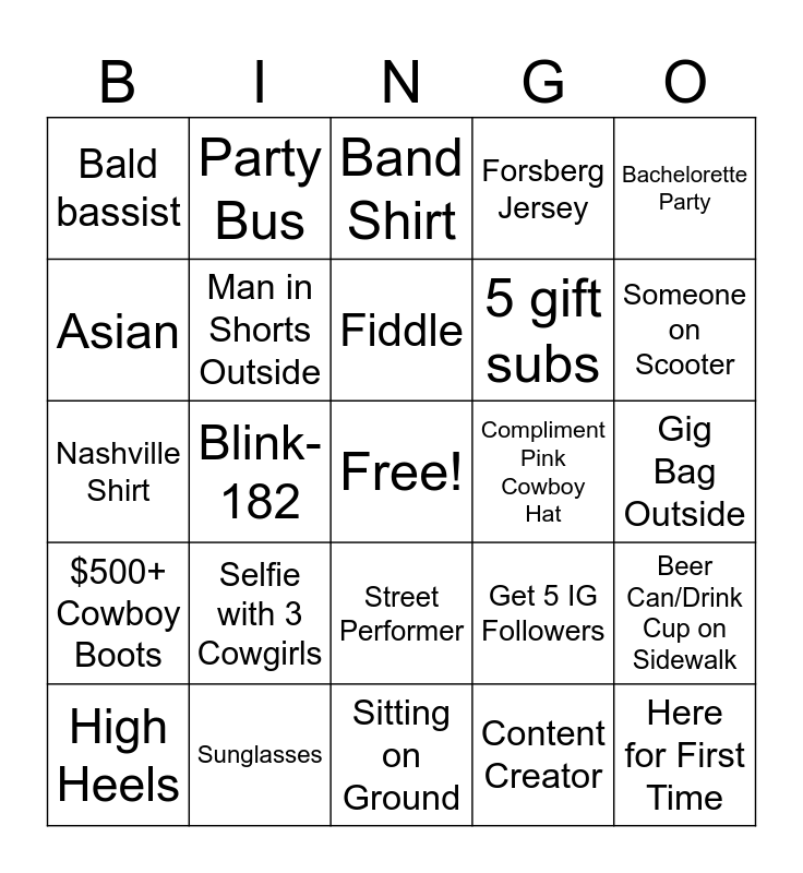 This bingo card has a free space and 24 words: Selfie with 3 Cowgirls, Sunglasses, Fiddle, High Heels, Bachelorette Party, Bald bassist, Asian, Party Bus, Compliment Pink Cowboy Hat, Street Performer, 5 gift subs, Nashville Shirt, Get 5 IG Followers, Beer Can/Drink Cup on Sidewalk, Man in Shorts Outside, Content Creator, Gig Bag Outside, Band Shirt, Someone on Scooter, Blink-182, Here for First Time, $500+ Cowboy Boots, Forsberg Jersey and Sitting on Ground.