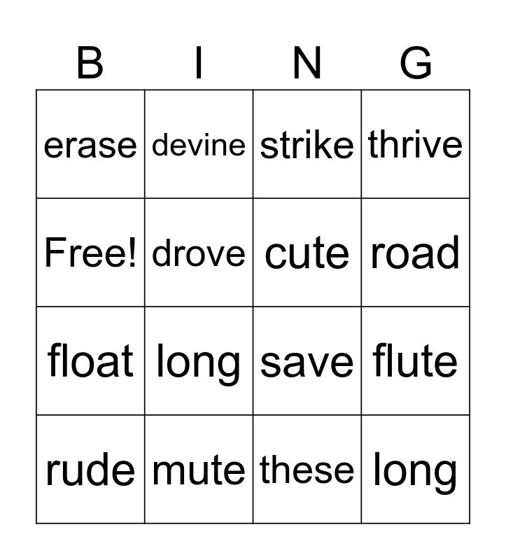 This bingo card has 16 words: mute, flute, strike, erase, float, devine, save, these, Free!, drove, rude, thrive, long, road, cute and long.