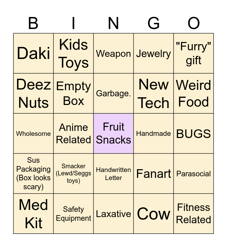 This bingo card has a free space and 24 words: Smacker (Lewd/Seggs toys), Safety Equipment, Garbage., Med Kit, "Furry" gift, Daki, Deez Nuts, Kids Toys, Handmade, Handwritten Letter, New Tech, Wholesome, Fanart, Parasocial, Empty Box, Cow, BUGS, Weapon, Weird Food, Anime Related, Fitness Related, Sus Packaging (Box looks scary), Jewelry and Laxative.