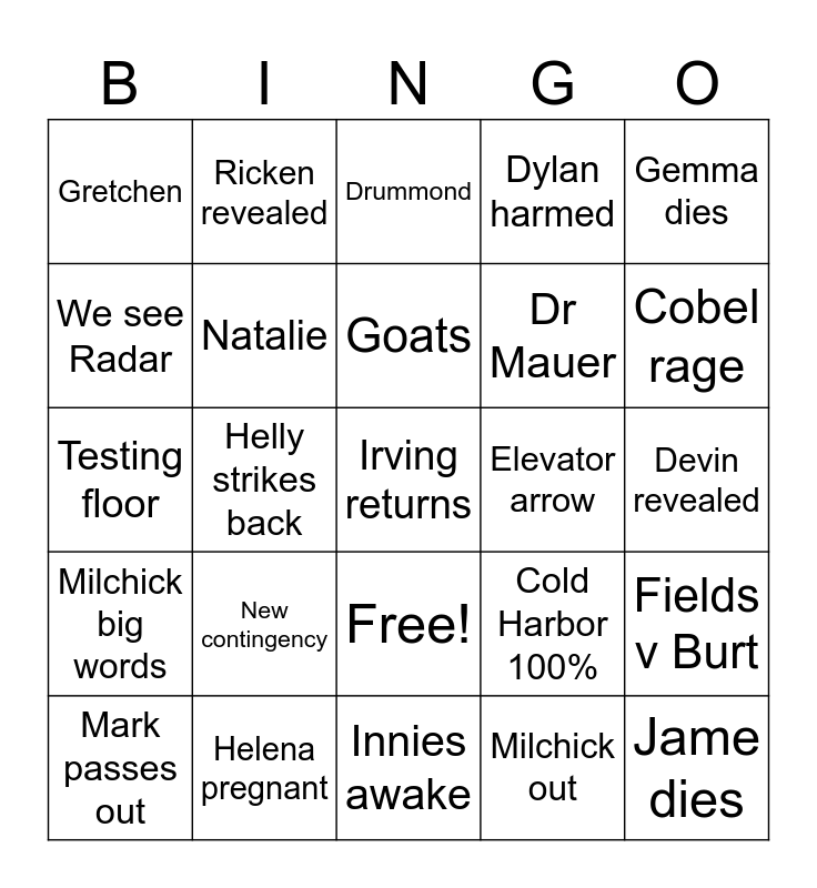 This bingo card has 26 words: Free!, Milchick out, Goats, Helena pregnant, Gemma dies, Gretchen, We see Radar, Ricken revealed, Devin revealed, Cold Harbor 100%, Dr Mauer, Testing floor, Fields v Burt, Mark passes out, Helly strikes back, Rebeck, Dylan harmed, Milchick big words, Drummond, Irving returns, Cobel rage, Innies awake, Elevator arrow, New contingency, Natalie and Jame dies.