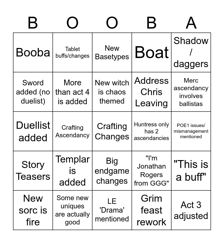 This bingo card has 25 words: Templar is added, LE 'Drama' mentioned, New witch is chaos themed, New sorc is fire, Shadow / daggers, Booba, Sword added (no duelist), Tablet buffs/changes, Huntress only has 2 ascendancies, Big endgame changes, Address Chris Leaving, Duellist added, "I'm Jonathan Rogers from GGG", "This is a buff", More than act 4 is added, Act 3 adjusted, POE1 issues/ mismanagement mentioned, New Basetypes, Merc ascendancy involves ballistas, Crafting Ascendancy, Crafting Changes, Some new uniques are actually good, Story Teasers, Boat and Grim feast rework.