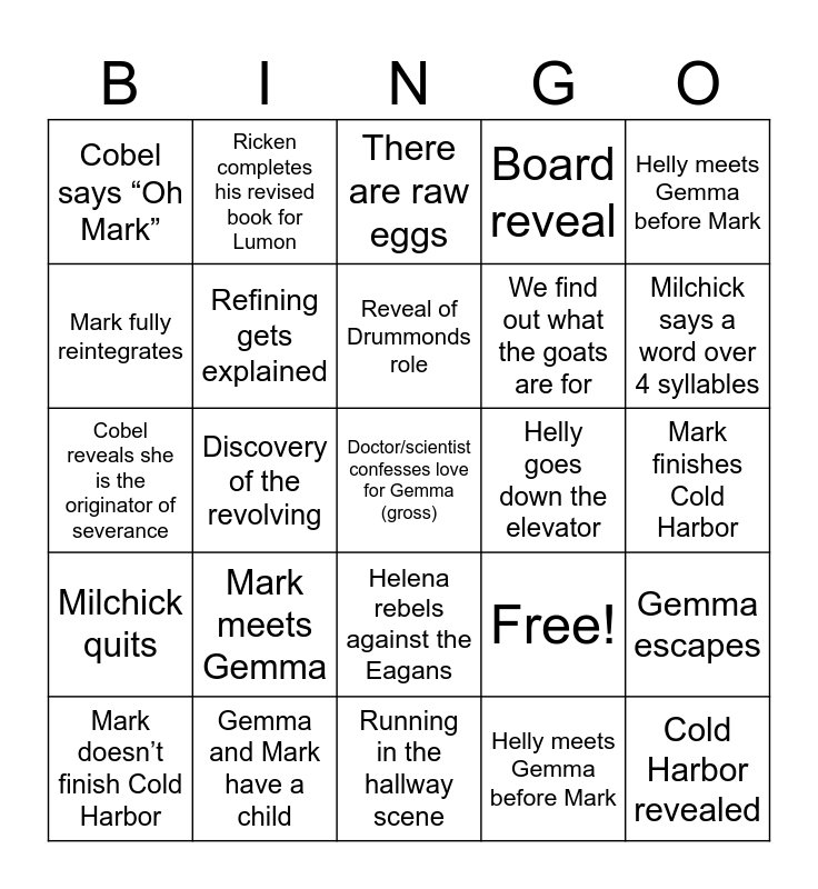 This bingo card has 25 words: Mark meets Gemma, Running in the hallway scene, Reveal of Drummonds role, Mark doesn’t finish Cold Harbor, Helly meets Gemma before Mark, Cobel says “Oh Mark”, Mark fully reintegrates, Ricken completes his revised book for Lumon, Helly goes down the elevator, Helena rebels against the Eagans, We find out what the goats are for, Cobel reveals she is the originator of severance, Free!, Gemma escapes, Refining gets explained, Cold Harbor revealed, Mark finishes Cold Harbor, There are raw eggs, Milchick says a word over 4 syllables, Discovery of the revolving, Doctor/scientist confesses love for Gemma (gross), Gemma and Mark have a child, Milchick quits, Board reveal and Helly meets Gemma before Mark.