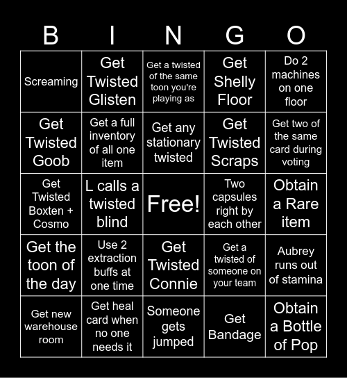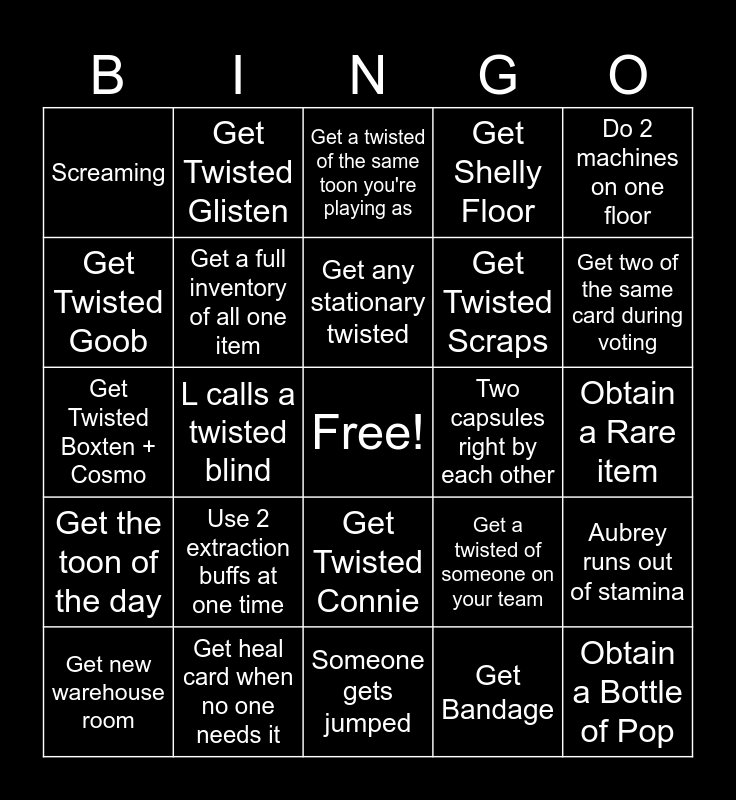 This bingo card has a free space and 34 words: Get Looey (my love! ❤️), Get Bandage, Get Twisted Astro, Obtain 200 tapes, Get the toon of the day, Get a full inventory of all one item, Do 2 machines on one floor, Get new warehouse room, Get Twisted Glisten, Dandy sells at least two of the same item, Get any stationary twisted, Get a twisted of the same toon you're playing as, Same twisted two floors in a row, Blackout, Two capsules right by each other, Get two of the same card during voting, Get heal card when no one needs it, Get Twisted Boxten + Cosmo, Use 2 extraction buffs at one time, Get a twisted of someone on your team, Get Twisted Connie, Two uncommons on one floor, Screaming, Obtain a Rare item, Someone gets jumped, Obtain a Bottle of Pop, Get Shelly Floor, Get Astro Floor, Get Twisted Scraps, Get Twisted Goob, Someone says "Bruh", L calls a twisted blind, Aubrey runs out of stamina and Someone calls me a big back.