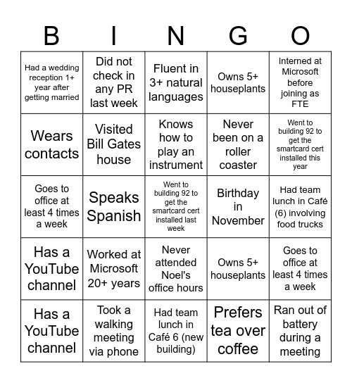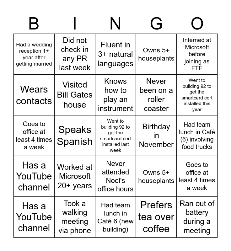 This bingo card has 40 words: Fluent in 3+ natural languages, Goes to office at least 4 times a week, Prefers tea over coffee, Visited Bill Gates house, Took a walking meeting via phone, Never attended Noel's office hours, Knows how to play an instrument, Remote joined a meeting after the meeting ended, Interned at Microsoft before joining as FTE, Has a YouTube channel, Speaks Spanish, Owns 5+ houseplants, Went to building 92 to get the smartcard cert installed last week, Had team lunch in Café (6) involving food trucks, Birthday in November, Worked at Microsoft 20+ years, Is left-handed, Had a wedding reception 1+ year after getting married, Has more than 2 pets, Fluent in 3+ natural languages, Goes to office at least 4 times a week, Prefers tea over coffee, Never been on a roller coaster, Wears contacts, Visited Bill Gates house, Took a walking meeting via phone, Never attended Neel's office hours, Worked from backyard / porch / balcony, Ran out of battery during a meeting, Remote joined a meeting after the meeting ended, Interned at Microsoft before joining as FTE, Has a YouTube channel, Plays a musical instrument, Owns 5+ houseplants, Went to building 92 to get the smartcard cert installed this year, Had team lunch in Café 6 (new building), Created Excel Formula in the last year, Has 5+ patent cubes, Did not check in any PR last week and blah.